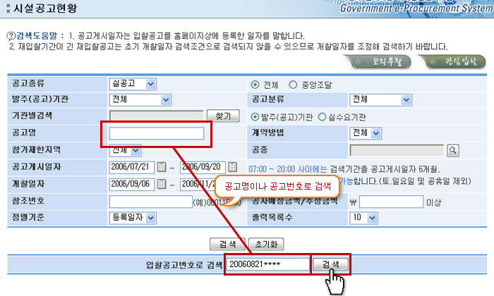 ÀÔÂû°ø°í¹øÈ£·Î ÀÔ·ÂÇÏ¿© °Ë»öÇÏ¸é ½Ã¼³ °ø°í¸ñ·Ï ¸®½ºÆ®°¡ °Ë»öµË´Ï´Ù. |