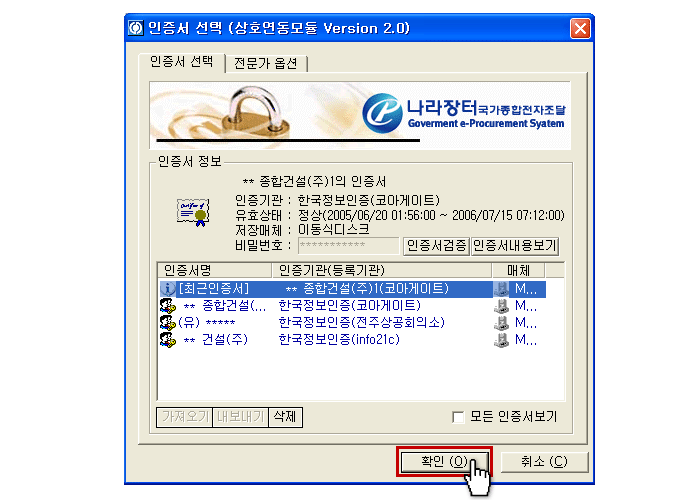 ÇØ´çµÇ´Â ÀÎÁõ¼¸¦ ¼±ÅÃÇÏ¸é ÆÄ¶û»öÀ¸·Î Ç¥½Ã ¾Æ·¡¿¡ ÀÖ´Â [È®ÀÎ] ¹öưÀ» Ŭ¸¯Çϼ¼¿ä. |